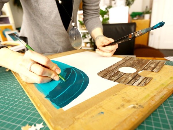 Szeretek kísérletezni és újítani de az utóbbi időben talán a montázs-akril duó alkalmazása a legizgalmasabb számomra; megkeresem azt az újságrészletet, szabásmintát, ami kapcsolódik valahogy a történethez és beleapplikálom. A Gúfó-sorozatban is sok az ilyen rejtett csemege, a Hold felszínét például világításról szóló szövegfoszlányok díszítik, a gombáknál pedig esetenként lexikon-szócikkekből, tudományos szövegekből használtam fel részleteket.
