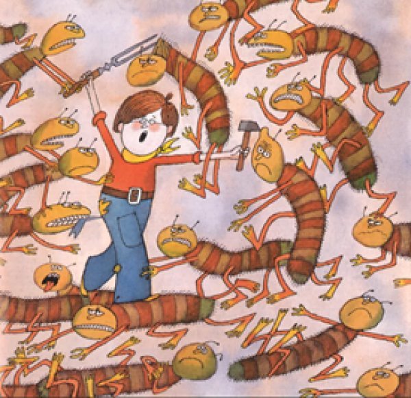 A több száz bacilus elleni küzdelem leírását látványos illusztrációk kísérik, egész oldalas, szöveg nélküli képekkel, egy helyen megszakítás nélkül, 4 teljes oldalon keresztül, vizuálisan is érzékeltetve a bacilusok sokaságát. Kropácsek megérzi, hogy valami történik a torkában, ezért kap egy bögre teát, amit legördít, vele együtt Machot, Sebesztovát, és a kutyájukat, Jonatánt, egészen a gyomorig. A groteszk, sci-fi jellegű jelenet a gyomorban már komolyabb anatómiai ismeretekről tanúskodik. Mindeközben Macourek úgy beszéli el a történetet, azzal a sodrással, ahogyan zajlanak az események: azaz például ömlik a tea a test belsejében, ömlik a mese is. Mire Nemlaha doktor kiér Kropácsekhez, Mach és Sebesztova megtisztítja a fertőzött torkot, és a fiú újból egészséges lesz. A külső tünetek felsorolása és kezelése helyett a belsőben zajló invázió megfékezését olvassuk, de nem orvosi szemmel, nem az anatómiai ismertek didaktikusságával, hanem egy perspektívaváltásból adódóan.