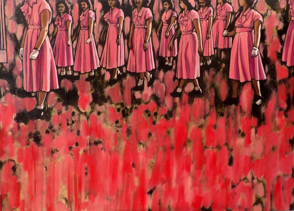 A kiállított festményeken javarészt fotórealisztikus, uniformizált női alakok jelennek meg, a felszín alatt kiszolgáltatottságról tanúskodó neutrális vagy olykor a pillanat kedvéért mosolygó arccal. A gyakran félbevágott, egyedi karakterüktől elválasztott nők kizárólag a biológiai nemük beazonosítására alkalmasak, ami a nők homogén csoportként kezelésének hibás társadalmi gyakorlatára hívja fel a figyelmet. Testtartásuk megfelelési kényszert metakommunikáló, erőltetett pózokról árulkodnak. Az ezekkel kontrasztban álló rózsaszín, fekete és – a japán paravánfestészetből kölcsönzött – arany színkombinációiban úszó absztrahált terek pedig direkt módon teszik bizalomgerjesztővé a képeket, emelve azok hangulatát, és tompítva a bennük kódolt ambivalenciát.