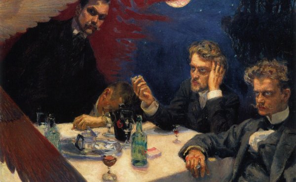 Akseli Gallen-Kalella, Symposion, 1894. Életkép Sibelius tivornyázásaiból. Balról jobbra: Oskar Merikanto (zeneszerző, az asztalra borulva), Robert Kajanus (karmester) és Jean Sibelius. Forrás: houstonsymphony.org