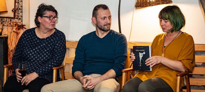 Még egy szövegrészlet felolvasásával zárult a moderált beszélgetés, ami tulajdonképpen a hely dadaista szellemisége miatt nem a megszokott értelemben zajlott, hiszen a házigazda nem feltétlenül kérdéseket tett fel, inkább megfogalmazta véleményét, olvasatát, a könyv egyes részeivel kapcsolatos gondolatait. A beszélgetés tartalmazott meghökkentő gesztusokat, sokszor a gondolatok, szavak sokaságában nehéz volt eldönteni, mire figyeljen az ember, azonban az elhangzottak – annak ellenére, hogy a nem először voltam a kötet bemutatóján – izgalmasak és tanulságosak voltak.