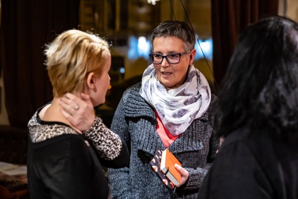 A felolvasás után Gáspár-Singer Puskás Pannihoz fordult, és arról kérdezte, hogy a szerkesztés és a színikritikák mellé hogy jött a novellaírás, és milyen út vezetett az első kötethez. Puskás elmondta, hogy természetesen az ő életéből sem maradt ki a kamaszkori „asztalfiók-időszak”, de aztán a színházelmélet iránti érdeklődése miatt egy időre eltávolodott az írástól. Szerinte azonban, ha valaki túl sokat foglalkozik mások műalkotásaival, előbb-utóbb megjön a kedve ahhoz, hogy maga is alkosson. Valami olyasmit szeretett volna írni, amit hiányolt a kortárs irodalomból, így született meg A rezervátum visszafoglalása. Az írói pálya megkezdésével kapcsolatban Gáspár-Singer nem mehetett el a kötet első novellájának (Leszámolás Bukowskival) kapcsolódó részlete mellett, melyben az elbeszélő arról számol be, hogy valószínűleg azért nem közölték a versét sehol, mert az általa említett lapok szerkesztőségében ülő férfiak „nem voltak felkészülve arra a szókimondó és bátor női hangra”, amit ő képvisel. Puskás rögtön leszögezte, hogy a szöveg nem róla szól, sőt, egyáltalán nem biztos, hogy a narrátor valóban tehetséges költő, ugyanakkor azt is hangsúlyozta, hogy szerinte „genderileg” még távolról sincs minden rendben a magyar kultúrában.