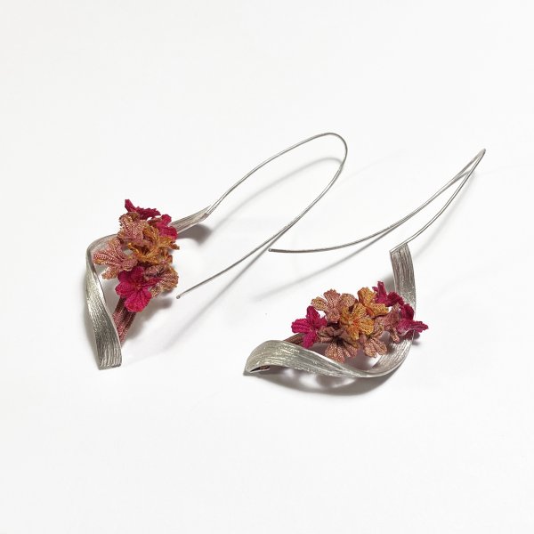 Tavasz fülbevaló (Földi Kingával közösen), 2023. Sterling ezüst, selyem, 30x75x25 mm.