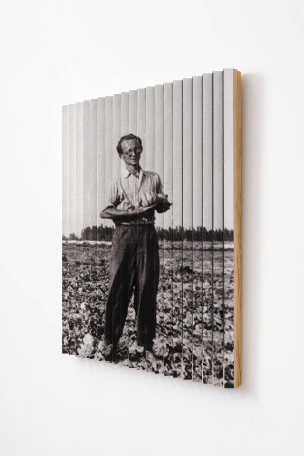 Két külön terem van, az „Agy” és mögötte van egy másik ugyanakkora terem, amiről az elején tudtam, hogy oda akarom az összes nagyapámmal foglalkozó munkát egybegyűjteni. Ott van egy nagyméretű projekció Feketén-fehéren címmel, ami Gazdag Gyula A sípoló macskakő című filmjének a zárójelenetének az átdolgozása. Ott van az Orthodromie című munkám, ami egy manuális lentikulár. Nagyapám életének két részlete, az egyik oldalról a kastély előtt áll kamaszként, díszmagyarban, a másik oldalon a kitelepítés alatt, hasonló testhelyzetben. Ezt nagyon fontos munkámnak tartom. Akkor ott van egy neon munka, aminek alapja az apám egy rajza, a nagyapámról, egy hármas portré, meg ott szerepel a Hermes & Erika, a két írógép, szintén portrészerűen fotózva. Szóval én azt tudtam, hogy az fontos csomópont, ott kell, hogy legyenek ezek a munkák egybegyűjtve. Amint ebből a teremből kilépsz, ott vannak a leginkább a Farkasvakság (acb Galéria, 2017) kiállításon bemutatott, gyászidőszak alatt készült munkáim, tehát a fa könyvek (Untitled (books), 2017), meg a póló lenyomat (Untitled (t-shirt), 2017), ami nagyon misztikus tárgy lett. Az az anyámhoz kapcsolódik. Ezért is mondom, hogy ez valahogy ez a női vonal így erősebb lett, főleg az új munkákban, a Timelines mellett például a piros-fehér-zöld című munkában is, ami a dédnagyanyám egy levelezéséből kiragadott részletek dolgoz fel. Az is érdekesen kapcsolódik az egész archívum kérdéshez.