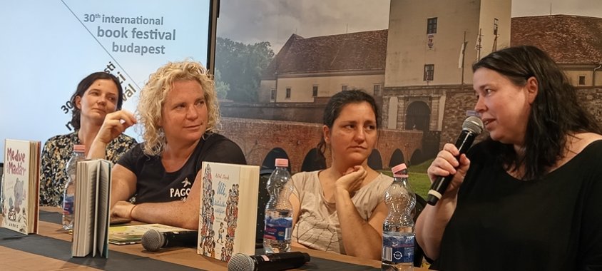 Sok érdeklődő gyűlt össze a teremben mindenféle korosztályból. A program moderátora Moldova Júlia volt, aki többek között a Pagony Kiadó szerzőit képviseli külföldön, emellett gyermek- és felnőtt irodalmat is fordít. Beszélgetőtársai szintén gyermekirodalmi műveket fordítanak: Rádai Andrea holland és angol nyelvből, illetve ő maga is ír könyveket. Győri Hanna német nyelvből, Rét Viktória pedig angol nyelvből fordít, és mindketten szerkesztők is a Pagony Kiadóban. Mindannyian tapasztalt gyerekkönyvfordítók, ezért számos érdekes történetet meséltek el a jelenlévőknek a saját pályafutásuk során szerzett tapasztalataikról.