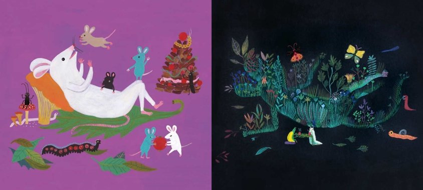 Kitüntetett pillanatok a szülés, születés és a halál, amelyek egymás melletti oldalpáron, párhuzamosan jelennek meg. Az anyaegér felett kukacbába őrködik, az apaegér kiszorul a jelenetből, az éjszaka sötét. A haldokló körül ezernyi féreg, meztelencsiga sürög-forog, színes gyümölcsök és színes növénytörmelékek világítják be az oldalt. Milyen körülmények között töltjük ezeket a pillanatokat? Miért a jelentős különbségtétel? Mit mond el rólunk ez az ábrázolás? Számomra ez az egyik legérdekesebb, egyben legnyugtalanítóbb kérdése a könyvnek.