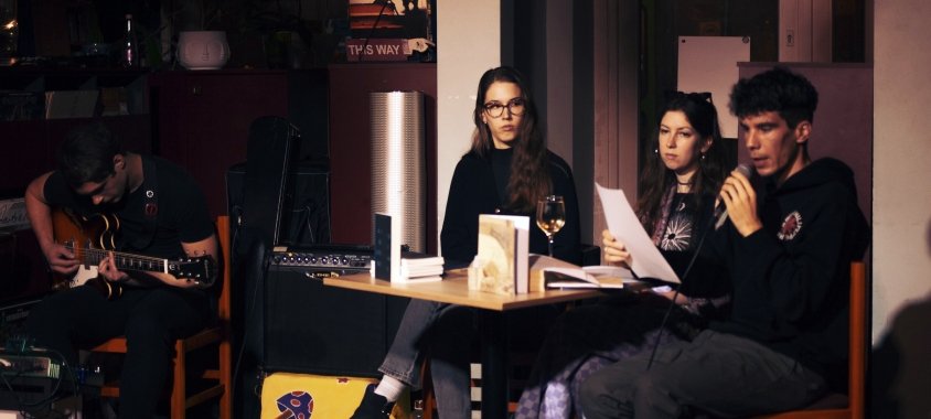 Vőneki játszani kezd a gitárján, mellé elektronikus háttérzajt csihol. Erre olvassa rá először Papp-Sebők, majd Ráday a kiválasztott verseit. Nehezen tudom eldönteni, hogy most épp egy hosszú, vagy több rövid vers hangzik el, de nem is ez a lényeg, hanem az, ahogy a hangzás által összekapcsolódnak. Urbán megnyitja az estet, röviden köszönti, bemutatja a két mellette ülőt, és egyből egy gyors bemelegítő kérdést intéz feléjük.