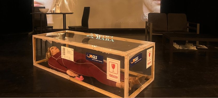 Ahogy elfoglalom a helyemet, észreveszem a már színpadon elhelyezkedő átlátszó ládát és az abban fekvő, piros egyberészest viselő női alakot. Sűrűn pislogok, próbálom eldönteni, hogy hús-vér ember-e, vagy csak egy baba. Ironikus módon, akkor sincs ebben könnyebb dolgom, miután a darab elején kikerül a dobozból. Nehéz nem látni ebben az embernagyságú ládában a groteszk kettőséget: egyszerre juttatja eszembe a játékbabák dobozát, ugyanakkor van valami koporsószerűsége is a faszegélyezés okán. A GLS matricák és a törékenységre való figyelemfelhívás erősítik a küldeményjelleget, illetve a darab során szintén bővül a jelentése is: a párkapcsolat törékenységére is vonatkozhatóvá válik.