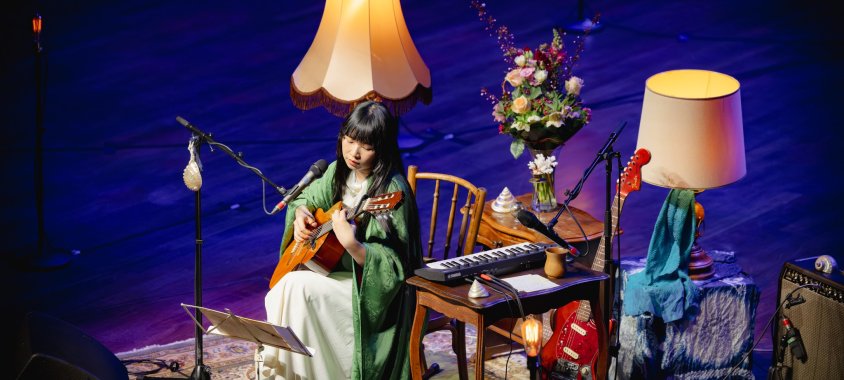 Mivel egyszemélyes produkcióról van szó, Aoba jelenléte csakis a színpad közepére korlátozódott. A díszlet első pillantásra egy nagyszobából kiragadott részletnek tűnt, ám miután Aoba játszani kezdett, gyorsan kiderült, hogy apró alkotóteret teremtettek neki a koncertteremben. Egy szék, egy csokor virág, két állólámpa, két gitár és egy asztal, melyen a szintetizátor helyezkedett el – ennyi elég is volt Aobának ahhoz, hogy megteremtse a hangulatot. A berendezés tükrözte, mennyire fontos, hogy legyen egy otthonos helyszín, ahol az alkotás zajlik. Egy ponton mintha már a gondolataiba is beférkőztünk volna. Aobánál a hangszer tisztelete igen markáns – a dalok végén mindig ráhajolt a gitárra, ezzel kimutatva háláját. Zenélés közben teázott, ami még inkább hozzájárult a meghittség megteremtéséhez.