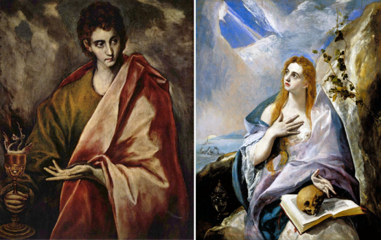 L. A.: Teljességgel véletlen. A Bűnbánó Magdolna múzeumunk saját gyűjteményébe tartozó kép, így adott volt, hogy a kiállításon szerepelni fog. Szent János Evangélista képét pedig azért kölcsönöztük a madridi Museo Nacional del Pradótól, mert párhuzamba kívántuk állítani a saját gyűjteményünkbe tartozó, ifjabb Szent Jakabot és Szent Andrást ábrázoló apostolképekkel. El Greco életművében jelentős helyet foglal el a bűnbánó szenteket és apostolokat megjelenítő tematika, így a célunk csupán annyi volt, hogy ezt érzékeltessük. Természeten a felvetett értelmezési lehetőség egy a sok közül, ami csak érdekesebbé teszi a művek befogadását. Persze mindez nem jelentheti azt, hogy El Greco a Szent János ábrázolásán kifejezésre kívánta volna juttatni ezt a párhuzamot – ő mindössze korának bevett ikonográfiai megoldását alkalmazta az evangélista szent esetében.