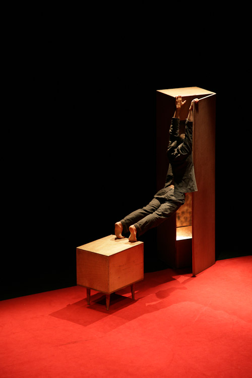 A darab szereplői valóban rejtélyes módon, maguktól mozognak, fizikailag lehetetlen egyensúlyi helyzetekbe kerülnek. A csak egyik végén alátámasztott, keresztbe fektetett nagy szekrény tetején hősünk nyugodtan sétál, míg a darab végén – szemünk káprázik? – alakja bele nem enyészik a színpadot körülölelő sötétségbe. Persze sejtjük, a bűvésztrükkökben valaki segédkezik, de mégis ámulatba ejt bennünket, mikor az előadás egy adott pontján „föllebben a függöny”, a színpad teljes fénybe borul, és csak két szekrényt látunk egymáson fekve, körben pedig a színházterem csupasz falait. Végül a tapsnál azért megmutatja magát a bűvészinas is, Martin, aki történetesen a színész (is), mégsem hiú – hisz még egy pillanatra sem látszik. Minimalista cirkusz, szofisztikált bűvésztrükk Stellato-módra.