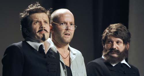 Az első pillanatban meghökkentőnek tűnő megoldás jó ötletnek bizonyul, lehetőséget nyújt ugyanis a két korszak összekapcsolására. És ez nem azt jelenti, hogy az előadás erőltetett párhuzamokkal élne, vagy megpróbálna direkt megfeleléseket keresni jelenkori közszereplőink és az akkoriak között. Néha egy-egy mondatban felvillan valaki, de nem ez a lényeg, hanem az, hogy a két korszak egésze kötődik össze, idealizált hőseink lesznek hozzánk hasonló esendő emberek. Emberek, akiket apró-cseprő sérelmeik, szerelmi viszonyaik éppen úgy befolyásolnak döntéseikben, mint a hon ügyei, és akik dönthetnének másként is, mint ahogy döntöttek, és akkor döntéseik egészen másféle világot eredményezhetnének. Bevallom, az előadás első felében voltak kétségeim, hogy felül tud-e emelkedni a darab azon a – számtalan vidám és szomorkás pillanatot nyújtó – ráismerésen, hogy egyenes adásban a történelem is hétköznapi történetek sorának tűnik. De sikerül, a schwechati csatajelenet, aztán a lezárás, a visszaugrás az újraírt jövőbe még a jelenkori magyar köz- és magánállapotokból erősen kiábrándult nézőbe is képes némi aktivizáló lendületet és reményt csepegtetni.