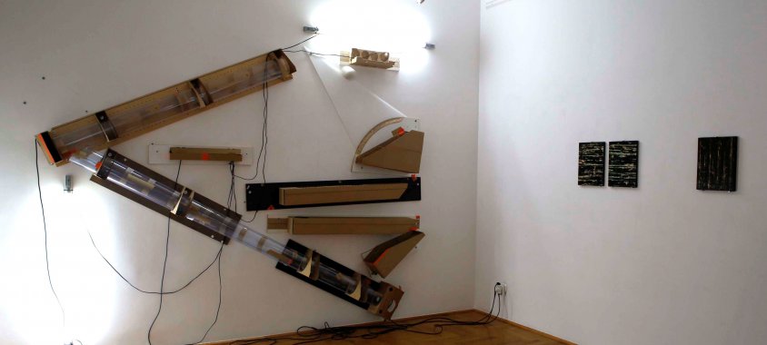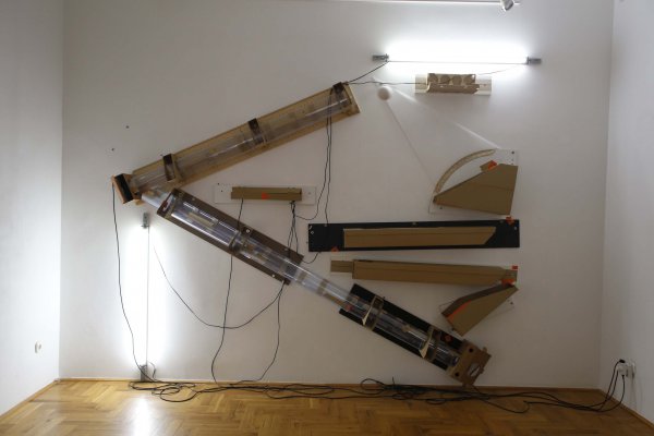 Ez a fajta nem titkolt barkácsszellem mutatkozik meg a tárlat másik nagyméretű objektje esetében is. Az itt szintén falra szerelt – a 2014-es Viennafair-en bemutatott változatában terepasztalként felállított – objekt a konstruktivista kollázsokat idézi. A Jó pásztor (2013) című munka eredetileg interaktív installációként a látogatókat is részvételre ösztönözte. Itt is megjelenik az akadálypálya, ahol a golyónak végig kellene mennie, de előbb-utóbb mindig a süllyesztőben végzi, nem jut el végső céljáig. A Molnár Ani Galériában kiállított verzió – hogy a barkácsáruházak világánál maradjunk – egy lapra szerelt, fémszerkezetű bútort idéz. A neonfényű panelek indusztriális hidegségét ellensúlyozzák az ottfelejtett ragasztószalagcsíkok, a struktúra esetlegessége, kombinálhatósága. Kézenfekvő a párhuzam: azoknak, akik külföldön próbálnak szerencsét, az alkalmazkodás és a rugalmasság éppolyan elengedhetetlen, mint a kreatív, nyitott hozzáállás az új élethelyzethez.