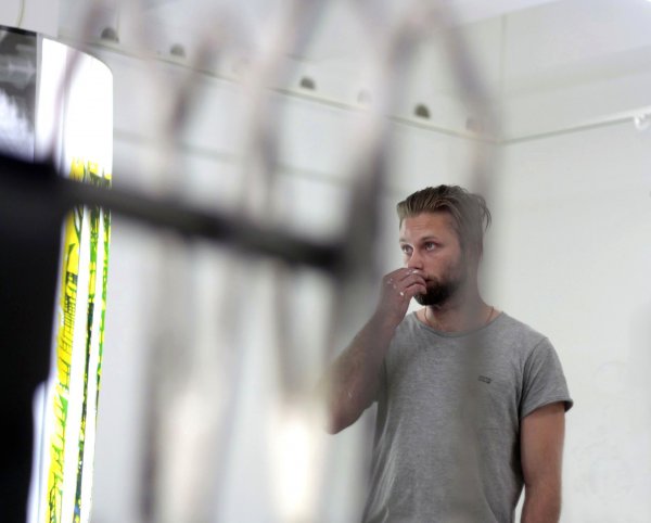 Mindig komplex projektekben gondolkodom, sohasem egy adott munkában. Jellemzően felkérésekre dolgozom, egy adott kiállításra születik meg egy nagyobb anyag. A mostani tárlat esetében is így volt, ami két szempontból fontos a számomra. Egyrészt az anyagválasztás, ami izgalmassá teszi ezeket a munkákat: igyekeztem ötvözni a szintetikus, kényelmetlen, fetisisztikus anyagokat a természetesekkel, a bőrrel, a fával, a földdel. Az volt a célom, hogy megtörjem a mesterséges matéria által kiváltott idegen érzést. Ezenfelül a kiállításon több munkában megjelenik egy fontos motívumom, ez a férfias, nagyon határozott, Y formájú alakzat, ami a megnyitó alatt többféle becenevet is kapott: volt, aki repülő rakétaként, volt, aki fallikus szimbólumként vagy transzformerszként hivatkozott rá.