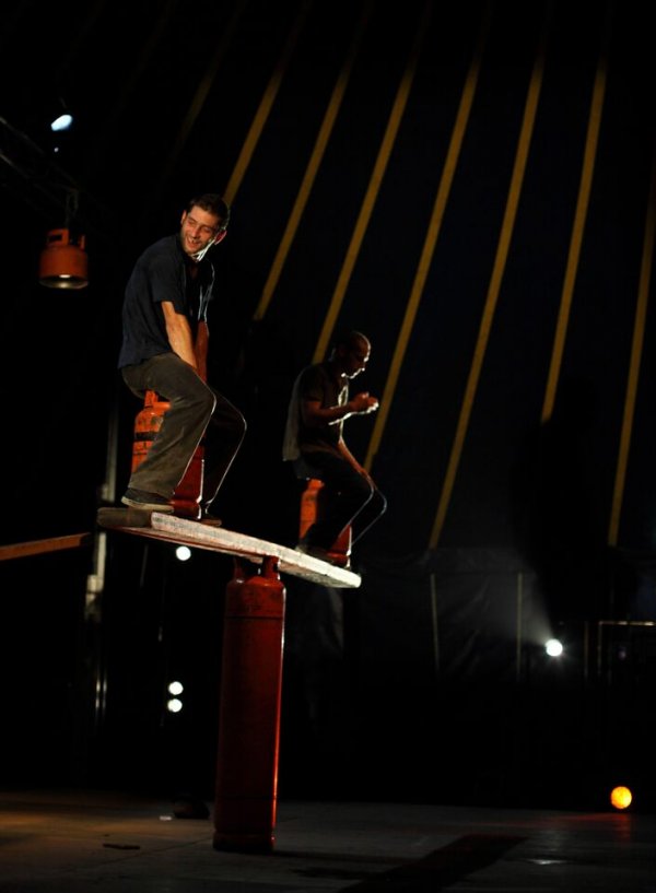 A színpadon akrobatikus és cirkuszi műsorszámok következnek, amelyeket lazán keretez egy építkezésről és rivalizálásról szóló történet. Fadeszkákból és súlyos gázpalackokból újabb és újabb, egymásra rakott, libikókaszerű építmények készülnek, a színészek ezen egyensúlyoznak, miközben hol segíti, hol gátolja egymást a két ép és egy kerekes székes szereplő.