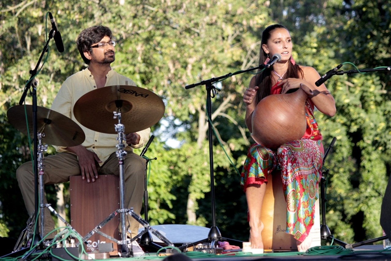 A Layanda most indít: meditatív, távol-keleti akkordokkal kezdődik el a koncert, amely az indiai zenét számomra tetszetős formában elegyíti a magyar népdallal. Tóth Szabi szitáron játszik, Fodor Réka mezítláb énekel, udun üti a taktust (ami eredetileg víztároló agyagedény tulajdonképpen) meg egyéb ütősökön, cajunon, csörgőkön zenél, Bakai Márton pedig hegedül. Zenéjük lényege az a fajta bábeliség, amely a világzene műfaját általában is jellemzi: egymástól távol eső kultúrák (nép)zenéjét dekonstruálni, a különböző zenei elemeket, technikákat új egységgé ötvözni – nos, ez Layandáéknak olyannyira jó arányérzékkel sikerül, hogy valamiféle lebegés hatalmasodik el rajtam immár, ingó pipacsvirágok nélkül is, ez a karnatikus zene hatása rám mindig is. Réka énektechnikája olykor vegyíti a laikus számára is felismerhetően Indiára jellemző zenei előadásmódot a flamenco hosszasan kitartott lamentáló elemeivel, így egészen újszerű lesz a létrehívott hangzás, a (szövegileg minimál) magyar népdal margójára (nota bene, a napokban jelent meg a Szerelem című első lemezük). Kedvencem egy imígyen dekonstruált magyar altatódal, a Beli, buba, beli, de a Kövecses porondon is bőven elhallatszik a mennyországba, annyira jól sikerült.