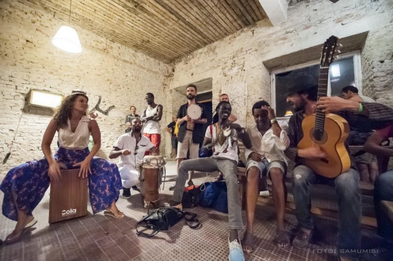 Gyuri nagy tállal mér nekem a kemencéből frissen kikerült sóletből, a hat órán keresztül héjában főtt tojást is nekem adja belőle. Remek ízek, nekiesek derekasan, a tojásról sosem tudtam, jóllakok, még mielőtt elfogyna a tányéromról, pedig még pályázom a kacsára is, ami a konyhai sütőben sül. Gyuri közben borokkal rohangál, én vagyok az egyetlen a Campen rajta kívül, aki igazi talpas borospoharat kap, üvegből valót, jobbnál jobb magyar borokat kóstoltat velem. Mindenki más műanyagból iszik, az ebédlőrész majd’ összes asztala tele van üres meg félig ivott söröspoharakkal, nagy a pazarlás. Most már biztosan nem megyek le a partra, táncházba sem, nem csak a sült kacsa tart izgalomban, de már alakulgat az esti jammelés is, ide-oda sétálok a saját kedvükre zenélő csoportok közt, az egyik asztalnál Yannis Papaioannou, a görög oudos a teljes Babra zenekarral rebetikókat játszik, örömmel csatlakozom ámánolni, úgy, tányérostól és teli szájjal; majd Varga Veronikával, a nagybőgőssel elénekeljük az Ajde Jano, ajde duso című szerb dalt, ami arról szól, hogyan adják el Janóék a lovat, a házat, meg mindent, amijük van, csak hogy mulathassanak, s a kolót járhassák. Valami ilyesmi a mi ars poeticánk is, a zenedrog teljesen átveszi a hatalmat a racionalitás fölött. Néhány dal erejéig Balogh Guszti, a Vojasa (és HolddalaNap, s még hány más együttes) énekese is csatlakozik, ők nemrég fejezték be koncertjüket a Vörös Kápolna színpadán; cigány dalokat is énekelünk, a Čaje šukarije refrénjét két szólamban ordítjuk együtt gyönyörűen. Aztán tovább barangolok a hangtérképen, a hátsó hangárban éppen kezdődik az afrikai dobolás, szenegáliak és ghánaiak gyülekeznek hangszereikkel, meg mindenki más is csatlakozik ütősökön, üstökön, aki csak teheti – alakulóban a törzsi hangulat. Útközben odafelé bebiztosítom a későbbi kacsasültet is, most kell jóban lenni igazán a konyhásokkal, nehogy elfogyjon az én részem is, míg a kultúrák közt járkálok, és előre láthatólag elveszek az időben – ezért minden különösebb felvezetés nélkül betoppanok hozzájuk, és elénekelek egy hallgatót romani nyelven, nevezetesen a Strávárdéstájduj rátyát, majd egy másik dalt beásul is, az Áhuz, mamát. A hatás nem marad el, a zene jól működő valuta errefelé: Sári, a cigányasszony, a fő-fő konyhasegéd, ahogy ő nevezi tisztségét, azonnal biztosít örök lojalitásáról, s lánya meg menye is csatlakozik eme kijelentéshez – megígérik, hogy a kacsaadagomat félreteszik a sütőbe, melegen tartják nekem, akármeddig is, nehogy jártamban-keltemben lemaradjak róla.