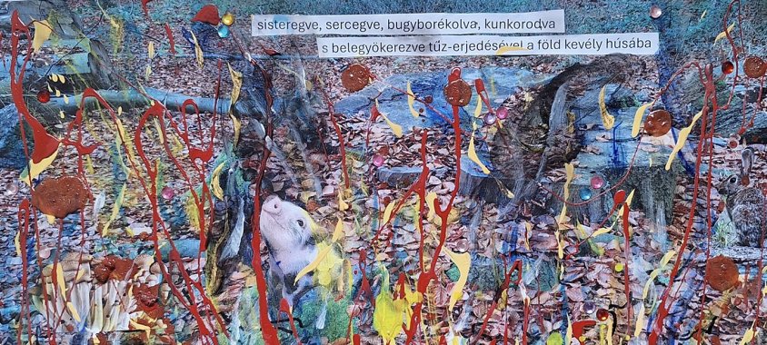 És itt átveszi a szót a Festő. Barics mondja: „Engem gyerekkorom óta érdekelt ez a kötet, A szent tűzözön regéi. Amit valamikor Édesanyám 1972 vagy 73-ban vásárolt Baján, és azok között a "szent" könyvek között volt, amik kikerültek velünk Németországba, amikor szüleim 1985-ben kivándoroltak Münchenbe. Juhász versei fiatal koromban nagyon sokáig értelmetlenek voltak számomra, de mivel mindig beleolvastam, évtizedeken át, és próbáltam megfejteni rejtélyét, valahogy beleszerettem. Most, halálának évfordulója alkalmából átfestett kollázsokat készítettem, melyekben vers-szilánkjai ebből a kötetből felbukkannak, és segítenek nekem is a világpusztulást valamiképpen feldolgozni. Festményeim mellett évtizedeken keresztül nagyon sok kollázst is készítettem. Imádom a kollázsokat. Ez az első sorozat, amit mutatok belőlük.”